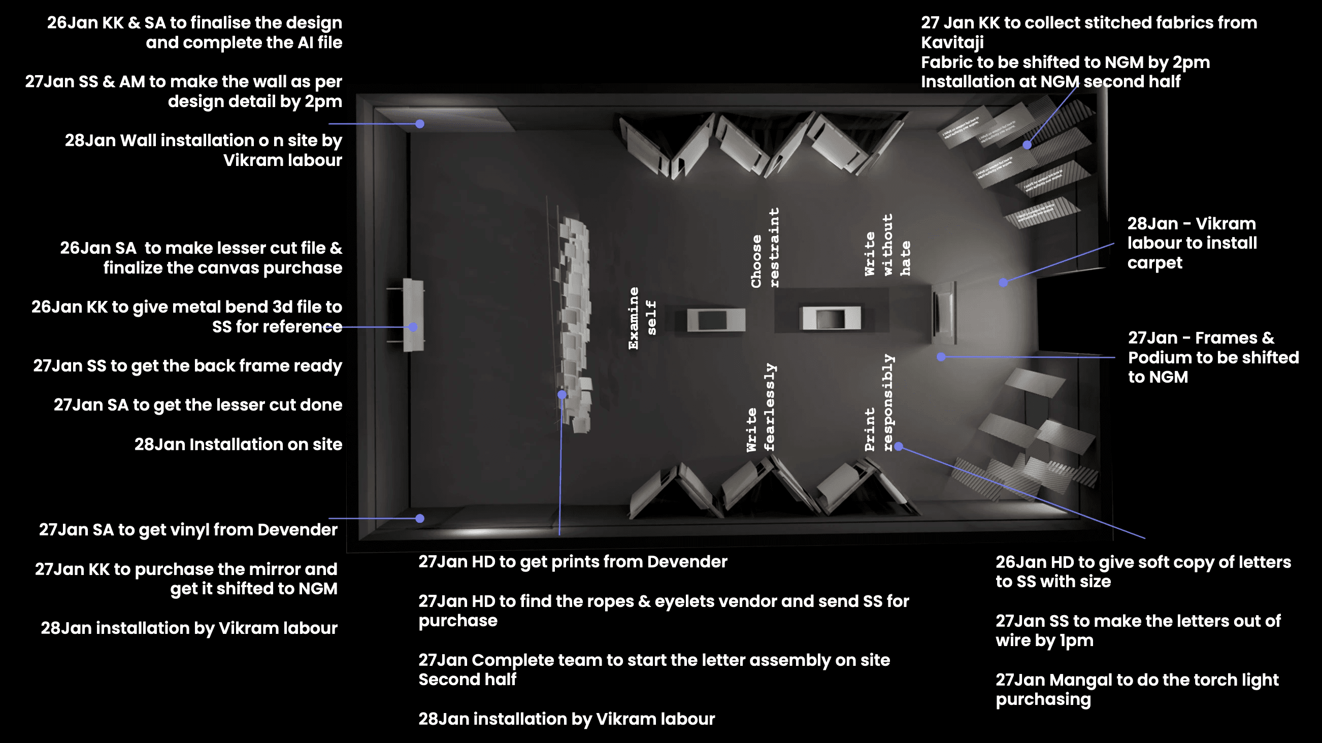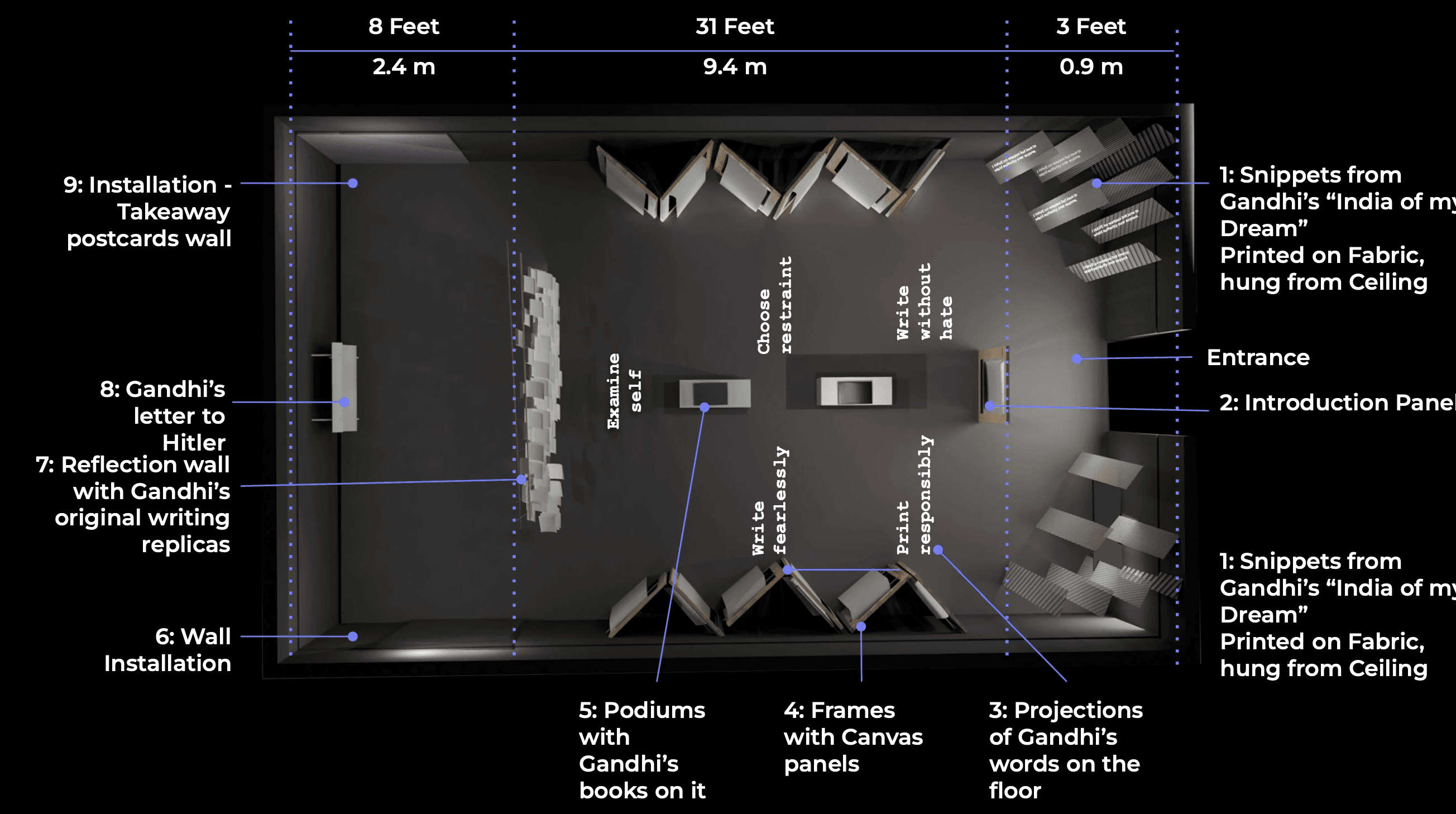The space was organised as a guided walkthrough using suspended fabric prints, framed panels, book podiums, and projection-based installations. Each element was placed to encourage reading, reflection, and movement through the space while maintaining a calm and minimal visual language inspired by Gandhi’s simplicity.
